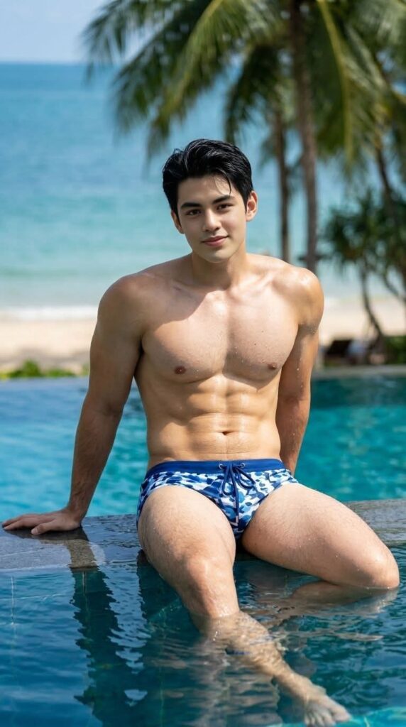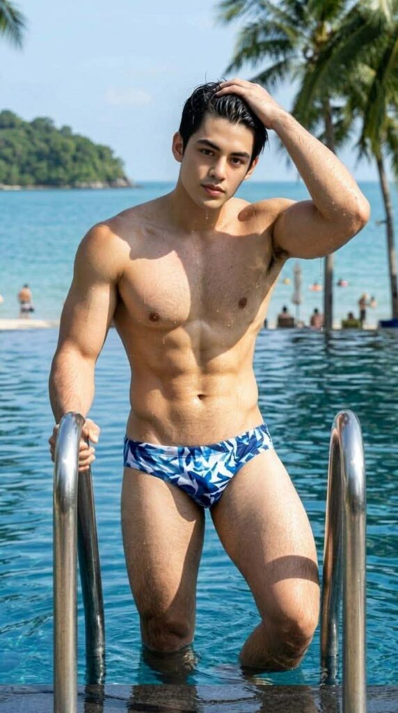 男生在游池或海边嬉水时, 不妨选择紧身平脚式泳裤; 反而思想前卫、衣着时髦的型男,亦可选择泳裤边稍靠近腰部的款式,图案可选用大块色构成的图形。