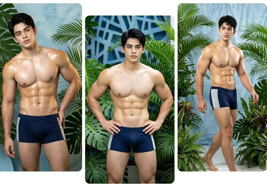 男生在游池或海边嬉水时, 不妨选择紧身平脚式泳裤; 反而思想前卫、衣着时髦的型男,亦可选择泳裤边稍靠近腰部的款式,图案可选用大块色构成的图形。